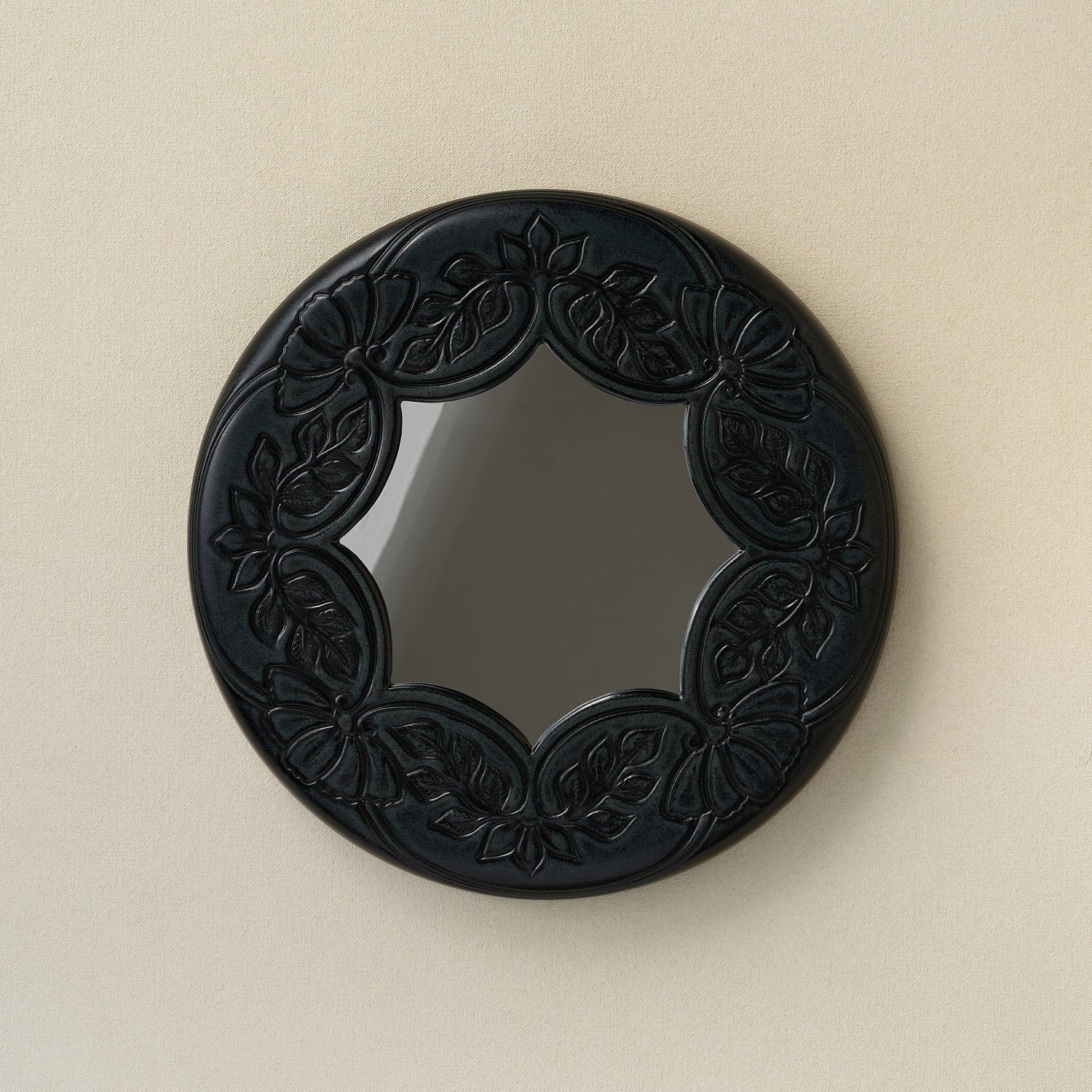 Matte black with a metallic depth—carved blossoms framing a star-shaped opening.