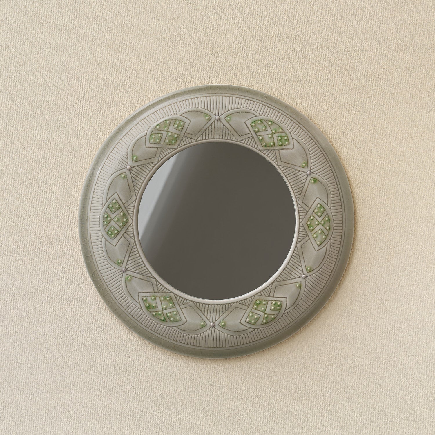 Pale gray, finely carved with geometric pattern—green and red slip dots anchoring each motif.